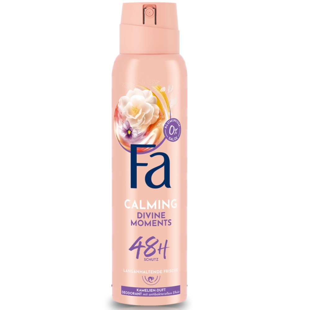 Fa Calming Divine Moments Spray Deodorant .Immerse yourself in the world of Fa and experience the mood-calming scent of camellias with the Fa deodorant. This gentle spray offers long-lasting odor protection while surrounding you with a soft, comforting fragrance. Its caring formula helps keep your skin feeling fresh, balanced, and beautifully protected throughout the day. 0% aluminum salts .